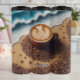 This unique illustration features a cup of coffee with beautiful, detailed latte art, resting on a small mound of coffee beans. The scene is set on a sandy beach, with a foamy ocean wave cresting nearby. The composition blends the cozy feel of coffee with the tranquil setting of the beach.