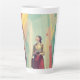 Kazuko is a Japanese photographer suspended in time, surrounded by pastel-colored architecture that seems to come out of a dream. A great latte cup with a beautiful and elegant Japanese art design showing Kazuko, a photographer in a whole vibrant world.