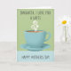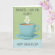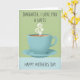 A heartfelt greeting card features a simple illustration of a steaming drink that feels cozy and affectionate, like sharing a quiet moment with someone you love ❤️. In the center, a soft turquoise-blue cup and matching saucer hold a warm brown beverage, inviting the eye to linger. Thin white steam curls upward in gentle swirls, like a tender sigh between close family members. The background is split in two, with a pastel green upper half that has a light grainy texture and a lower half in a matching blue that grounds the scene. Across the top, the message “DAUGHTER, I LOVE YOU A LATTE” appears in a friendly hand-drawn style in dark lettering, sitting above the cup. Near the bottom, “HAPPY MOTHER’S DAY” is placed below the saucer in the same dark tone, neatly balancing the layout 🌼. The final look shows the white steam rising in three curling lines against the soft green upper background.