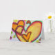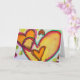Peach and orange hearts connect like blowing bubbles drift together. A green outline traces each heart. Pale yellow color dots are like confetti between the hearts. The watercolor painting has a light layer of gold and pink on top. Personalize this card with your own text and images using the customize it option. Detail from Inspirational Word "Laugh" painting.