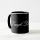 Black and white designer coffee cup . The black background can be switched to any color. The laugh, love live text can be personalized to any message. Text is also removable.