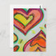Yellow, peach, and orange hearts form two concentric hearts gliding towards each other tip to tip. Pale yellow color dots are like confetti between the hearts. The watercolor painting has a light layer of gold and pink on top.