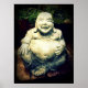 This is a concrete figure of a happy and joyful, round bellied Buddha in a garden setting with greenery bedding and bonsai plants in the background.