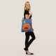 Adorable laughing Halloween pumpkin. A dead tree, a creepy mansion, some bats, and the moon are seen on the background.