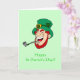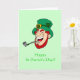 A laughing leprechaun with ginger beard, clay pipe, and shamrock in his hatband.