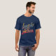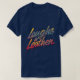 The t-shirt design features the phrase "Laughs in Leather." in bold, multi-colored letters that drip down like paint on a black background. The letters are stylized in a graffiti art style, giving the design a rebellious and edgy vibe. The overall effect is visually striking and eye-catching.