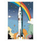 A sleek space rocket blasts off, its trail of fire and smoke rendered in vibrant rainbow retro artwork, creating a striking fusion of futuristic propulsion and nostalgic color. The dynamic hues streak across the sky, evoking a sense of wonder and excitement as the rocket ascends into the cosmos.