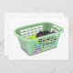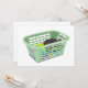 The humble laundry basket never looked as good as this design. It is a green laundry basket, the plastic kind with some nicely folded clothes in it. It actually makes a good household item design. This laundry basket design looks great on these invitations