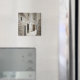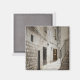 Souvenir photo magnet of laundry consisting of white blankets hanging to dry in the sun on the facade of a white stone house in an alley with sandstone stairs in a town in Italy, creating a typical Italian/mediterranean street view.