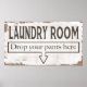 A fun sign that says "Laundry Room" and in a box with an arrow pointing down it says "drop your pants here".