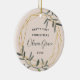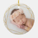 Celebrate your little one's first Christmas with this charming holiday ornament. Round design features "baby's first Christmas" along with baby's name and the year, surrounded by a faux gold foil border accented with green winter leaves. Add a photo to the back with a matching golden geometric frame.