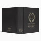 Image of black vintage leather background with a sparkling looking laurel wreath in silver and gold. Customizable text.