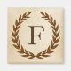 A delicate laurel wreath is layered over a parchment paper background in the classic Roman style. This design is personalized with the monogram "F" in a rich sienna tone.