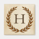 A delicate laurel wreath is layered over a parchment paper background in the classic Roman style. This design is personalized with the monogram "H" in a rich sienna tone.