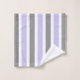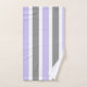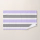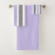 This matching set includes a lavender, grey, and white striped hand towel and washcloth, and a lavender bath towel.