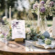 This wedding invitation features an elegant floral motif with soft purple, lavender, and white blooms accented by greenery in the top corner. A thin, curved purple border frames the text, which is centered and styled in a graceful serif font. The phrase “YOU’RE INVITED” runs vertically along the right edge, adding a modern touch. The layout is clean and formal, with the event details clearly presented and a note that a reception will follow. The overall design blends romantic charm with refined simplicity