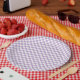 A simple lavender and white gingham checkered pattern, on these wonderful paper plates. We carry this in many other colors as well.