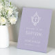 A lavender and white baptism welcome sign.