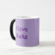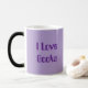 This Morphing Mug displays the words I Love Books. The I Love Books text is on both sides of the mug in purple text. The background of the mug is a lavender color. This mug is a Book Lovers Mug. The morphing mug shows the I Love books purple text and lavender background when you put a hot drink in the mug. The image is on both sides of the mug. This mug is an eleven ounce mug with 3.2” D x 3.8” H dimensions. This mug is made with strong ceramic construction. The mug meets the FDA requirements for food and beverage safety.