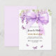 An elegant white background, decorated with a large lavender, purple colored bow, wisteria flowers and butterflies. Personalize and add a name and party details.