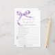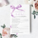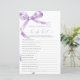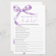 Lavender Bow "Who Knows The Bride Best" Game – Add some fun to your bridal shower with this charming game card featuring a delicate purple bow design. This "Who Knows The Bride Best" game is perfect for engaging guests and celebrating the bride-to-be in style. With elegant script and feminine accents, this game card is a beautiful addition to any bridal shower theme, making it a memorable keepsake for the bride and her loved ones.