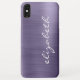 This trendy phone case features a modern background design of lavender purple faux brushed metal foil. Personalize it with your name running vertically up the right side in white handwriting script.