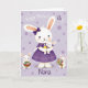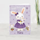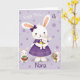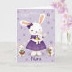 Designed with a soft lavender glow, this digital illustration shows a gentle family of bunnies gathered close, their faces turned toward one another with a tender, affectionate focus ❤️. At the center, a larger bunny in a deep violet gown with white lace trim cradles a smaller bunny, and the two share a calm, caring gaze. A dark purple bow sits on one ear, and a light blush on the cheeks adds warmth to the serene expression. The small bunny holds a shiny golden oval like a treasured gift, tucked carefully between its paws. On the left, another little bunny offers a woven basket filled with pastel decorated ovals, while on the right, a matching bunny extends a cone-shaped holder packed with multicolored flowers 🌼. A short greeting appears near the top in light-colored lettering, with a smaller line of text placed below in a darker purple for contrast. Behind them, the background is a soft purple field dotted with darker lavender polka dots.