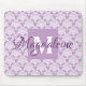 This beautiful mouse pad features a classic white damask pattern over a lavender or dusty purple background. The design is personalized with a monogram initial letter as well as a customizable name. Perfect gift for any woman who wants a pretty and feminine mouse pad with a simple yet elegant design.