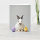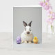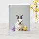 This greeting card features a white bunny with dark markings around its eyes and on its ear tips, sitting calmly at center with a small pink nose and a gentle, attentive gaze 🐰. To the left, a smooth lavender egg with neat white polka dots leans into the scene, adding a sweet, friendly balance. On the right, a tiny fluffy yellow chick stands upright, angled slightly toward the bunny as if keeping close company 🐇. The three figures are arranged like a quiet little trio, with the chick’s bright color echoing the bunny’s soft warmth in a subtle, affectionate way. The background is a simple light gray studio setting that keeps the focus on the soft fur, downy feathers, and the egg’s glossy finish. Across the upper portion, short Easter text sits centered in a light pastel tone, standing out gently without overpowering the picture 🌷. Soft, even lighting smooths the scene and keeps shadows minimal, so the textures look tender and touchable. The lavender egg on the left shows evenly spaced white dots and a faint highlight along its curved edge.