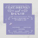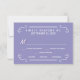 Eat, Drink, and be Married -- Vintage style rustic country wedding invitation personalized RSVP Response Cards -- Swirly, curly scrolls and old-fashion woodcut typography in radiant white on pastel lavender purple background. Add the bride and groom names and wedding and reply dates in this easy to use template. Elegant but fun and whimsical, retro hand-written style can be can be easily modified for your formal or semi-formal wedding themes. Casual modern country style is perfect for trendy rustic weddings with a fun touch of sophisticated charm for traditional couples. Please contact us for help with customization if you need additional room for your wedding details. Other sizes and styles available, along with matching invitations, postage stamps, coordinating accessories and shower favors.