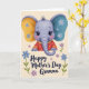 This card features a stylized young elephant peeking up from the bottom edge, as if leaning in for a friendly hello ❤️. Its smooth lavender skin is paired with blush-pink cheeks and large, dark, sparkling eyes that feel like a gentle, affectionate gaze. One oversized ear is golden-yellow and the other is teal-blue, and both are dotted with tiny pale-blue flowers that add a soft, romantic touch. The elephant wears a red tunic with small golden polka dots and striped cuffs, giving it a dressed-up look like it’s ready for a sweet moment with someone special. Behind it, a creamy beige background is sprinkled with small blue and lavender wildflowers that loosely frame the center. A short Mother’s Day message sits above the elephant in a flowing dark-gray line style, with a smaller line of text tucked just beneath it in lighter gray, and a little 🌼 near the lettering. Subtle shading along the trunk and under the chin adds depth, and the flowers are scattered in the corners and along the lower border.