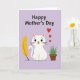 This card features a soft lavender background that gives the scene a gentle glow, with a stylized white cat centered as the main focus. The cat’s large green eyes and small coral nose create a tender, affectionate look, as if it’s quietly sharing a sweet moment with the viewer ❤️. Thin black whiskers and a simple, rounded shape keep the illustration airy and calm. To the left of the cat, a golden-yellow feather stands upright, adding a warm accent that feels like a friendly little flourish. To the right, a leafy green plant sits in a terracotta pot, suggesting a cozy indoor corner and a calm, caring atmosphere 🌼. Near the top, a short message appears in dark lettering, placed above the cat so it reads first without overpowering the artwork. Just above the cat’s head, three small red hearts float in a neat cluster against the lavender backdrop.