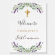A chic white background. Decorated with lavender flowers and eucalyptus greenery. A faux gold cross. Personalize and add a name. Black and golden letters.