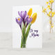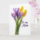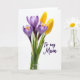 Designed with a simple spring bouquet on a bright white background, this card features soft lavender-purple flowers that look like early crocuses, paired with two sunny yellow buds that feel like they’re leaning close in quiet affection ❤️. The blooms sit slightly left of center, rising on slim green stems that guide your eye upward through gently opened petals. Light falls in a soft, diffused way, making the lavender petals look faintly see-through with fine lines showing in the veining. The yellow buds stay more closed, adding a sweet contrast, like a shy companion beside a more open friend 🌼. On the right side, the words “To my Mum” appear in a flowing handwritten look, spaced neatly with plenty of white space around them. The text is set in a dark tone that stands out clearly against the pale background without overpowering the flowers. Small golden touches appear near the centers of the purple blossoms, and the green stems taper delicately as they reach upward.