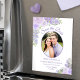 These beautiful magnetic wedding save the date cards feature a rustic yet elegant hand painted floral design with your photo in an oval frame surrounded by watercolor roses, blossoms, and flowers in shades of light purple, lavender, and lilac, with a bevy of eucalyptus leaves, greenery, and foliage. The typography features fancy script lettering. This stylish boho chic card is a great way to make sure your friends and family are aware of your upcoming wedding.