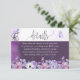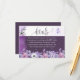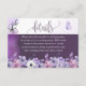 A romantic purple floral wedding details card featuring soft watercolor flowers in lavender, blush, and white, paired with delicate botanical line art and a graceful butterfly accent. The elegant layout combines a clean white upper section with a deep plum panel and a lush floral border along the bottom, creating a stylish and coordinated insert for sharing wedding information, venue directions, accommodations, RSVP notes, and reception details.