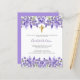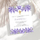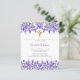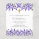 A white background decorated with watercolored lavender flowers and a golden cross. Personalize and a name and details.