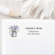 A white background. Decorated with a lavender florals in an old vintage garden watering can. Personalize and add your name and address. Black letters.