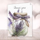 This design features a watercolor illustration of lavender flowers in a glass jar. Text reads, "Thank you." Inside of card is blank.
