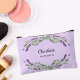 A violet background. Decorated with lavender flowers and eucalyptus greenery.