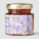 A beautiful photograph of a field of purple lavender flowers is featured on these custom personalized wedding honey jar favors.