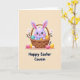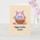 This card features a soft lavender bunny with long upright ears peeking from a woven basket, its wide eyes and rosy cheeks giving it a sweet, friendly look 🐰. Around the bunny, patterned eggs in blues, yellows, and pinks fill the basket, while a few rest below as if gently set down for someone special. Small white blossoms and a couple of dark sprigs sit near the base, adding a quiet, affectionate touch like a shared springtime moment 🌷. The background is a creamy, pale tone that makes the pastel colors stand out without looking harsh. Light shading and subtle highlights give the basket weave, the bunny’s fur, and the eggs a softly rounded, dimensional feel. A short greeting line is placed beneath the illustration in a simple, easy-to-read font, shown in a darker color that contrasts with the light background. The eggs show a mix of stripes, tiny floral motifs, and dotted accents, with a gentle glossy shine on their surfaces. The basket’s braided texture is clearly visible, with curved handles framing the bunny at the top.