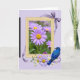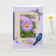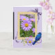 Designed with a soft lavender background, the card centers on a golden rectangular frame that feels like a gentle embrace around a close-up garden photo. Inside the frame, purple-petaled daisies with sunny yellow centers sit in a slightly blurred, dreamy focus, like flowers shared between close friends ❤️. A single central bloom radiates outward with neatly layered petals, drawing attention the way an affectionate glance does. In the upper right corner, a purple ribbon with small white polka dots is tied into a bow, with its tails curling downward and around the framed image. Beneath the frame, small white and purple daisies scatter across the foreground, and a bright blue bird perches among them, its sleek feathers catching light with a subtle metallic shine 🌼. The bird’s eye turns toward the viewer while the ribbon threads behind it, visually linking the bow to the flowers like a quiet connection. Along the far left edge, a stark black vertical bar stands in sharp contrast to the otherwise soft lavender and floral details.