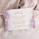This elegant wedding details card features a lavender watercolor border design in imitation of marble veined with faux gold foil, fading gradually into the white background. The word "details" appears in gold-colored handwriting script, with the remaining text in gold-colored serif capitals. The lavender and gold marble pattern is repeated on the back of the card.