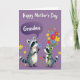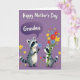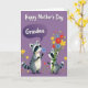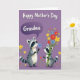 Designed with a soft lavender background, the card shows two friendly woodland animals with striped tails and distinctive face markings sharing a tender moment ❤️. The taller one stands on the left, holding out a small blue flower as if offering it with a gentle, affectionate glance. Above its head, a deeper purple thought bubble contains the word “Grandma” in light lettering, making the message easy to spot. On the right, the smaller companion hugs a large bouquet of wildflowers, tied with a green ribbon, and its wide eyes and slight smile suggest warm closeness between them 🌼. The flowers mix sunny yellows, rich reds, and calm blues, adding lively contrast against the purple backdrop. Soft shading and rounded shapes give the pair a cozy, storybook look without feeling too busy. Near their feet, tiny colorful blossoms are scattered across the ground like confetti in pinks, yellows, and blues.