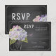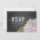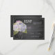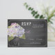 Lavender hydrangeas in mason jar and chalkboard RSVP card for a rustic country theme wedding.
