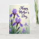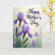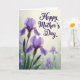 This card shows two tall iris flowers in the foreground, their ruffled petals unfolding in shades of purple and lavender with fine vein lines that feel like a gentle embrace ❤️. Slender green stems lift the blooms upward, with a couple of small buds nearby that lean in as if keeping close company. Soft, diffused light washes over the petals, giving them a velvety look and a quiet, romantic hush, like two friends sharing a private moment. At the center of each flower, warm orange and yellow accents glow and pull your eye inward. The background fades smoothly from creamy yellow into a muted sage green, with blurred floral shapes suggesting a garden just beyond. A short line of dark, flowing cursive-style text sits in the upper-right area, standing out clearly against the pale backdrop 🌼. The two irises are framed by faint, out-of-focus blooms in the distance, adding depth behind their green stalks.