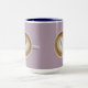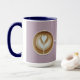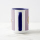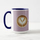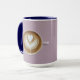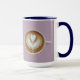 This latte mug features a top-down view of a latte art coffee in a lavender ceramic cup before a solid lavender background. The latte art features a white heart shape in the center with swirling patterns radiating outward, creating a symmetrical design. The coffee is a rich brown color with a smooth, creamy surface. The cup has a simple, modern design with a curved handle on the right side. The mug is a Combo Mug. The mug is a Navy Blue and White Combo Mug. The mug is a fifteen ounce size.