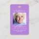 A lavender colored background, a Space for your photo. A golden cross. Light beams, behind the photo. Personalize and add name, dates and your text and prayer.