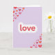 This greeting card features a soft lavender background that sets a calm, loving mood. In the middle, the word “love” appears in deep red and stands out as the main focus. The letters have a gentle glow around them, like a soft light that makes the message feel warm. Small hearts decorate the top-left and bottom-right corners, adding a sweet touch without crowding the space. The hearts come in shades of coral, pink, and dark red, and they face different directions for a relaxed, scattered look. A few hearts look like they’re made from two matching halves placed side by side, while others are solid shapes, which hints at closeness and togetherness. Overall, the design feels simple and affectionate, perfect for a romantic note or a kind message to a friend 💕❤️. Hope it helps you share a little extra love on Valentine’s Day.